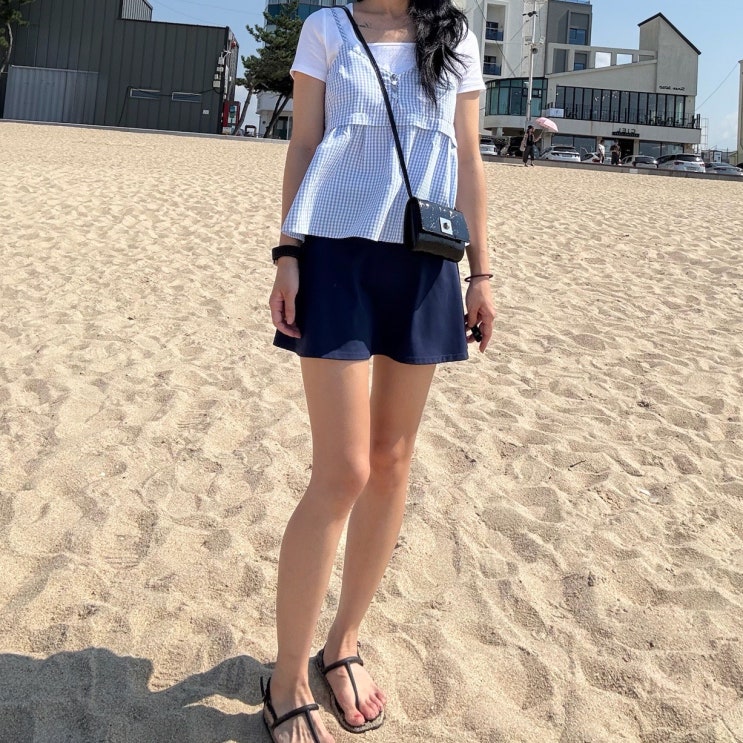 1만원대 체크 뷔스티에로 완성하는 청량미 넘치는 40대 동안 코디 :: 제너럴아이디어 시어서커 슬리브리스 블라우스 무탠다드 스퀘어넥 티셔츠