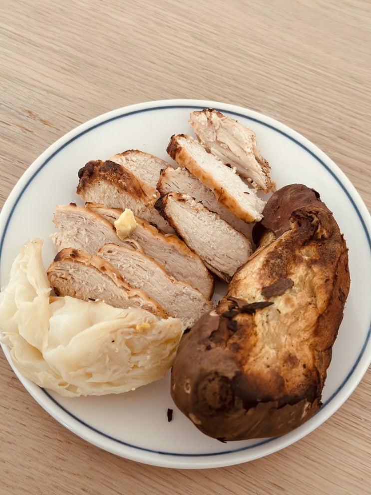 닭가슴살 우유에 담궈두고 난뒤 에어프라이기구어준 상태. 고구마도 에어프라이기에 60분 구운 상태 양배추...