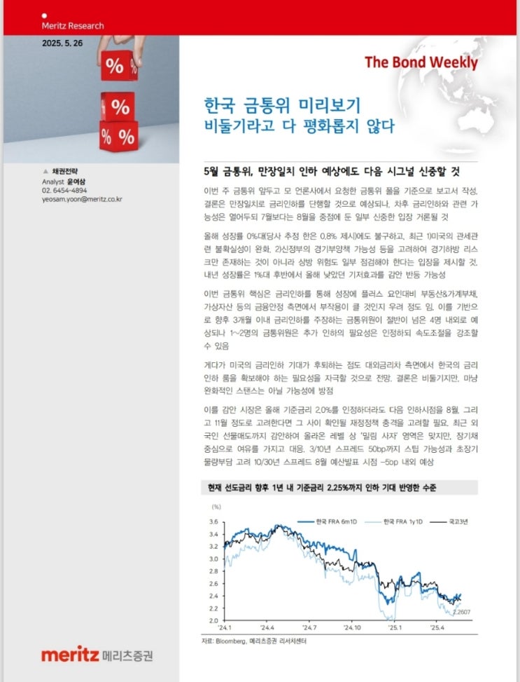 내일 열리는 금통위에서는 금리 인하가 유력. 단 하반기로 갈수록 여러가지 변수들로 인해 금리 인하에 대...