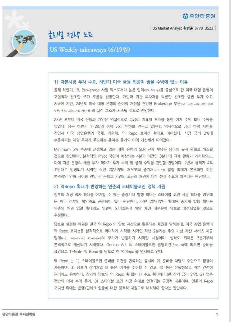 1. 오늘은 유안타에서 나온 글로벌 전략노트. 파월이 드뎌 하반기에 금리인하를 고려하겠다고 발언도했고 ...
