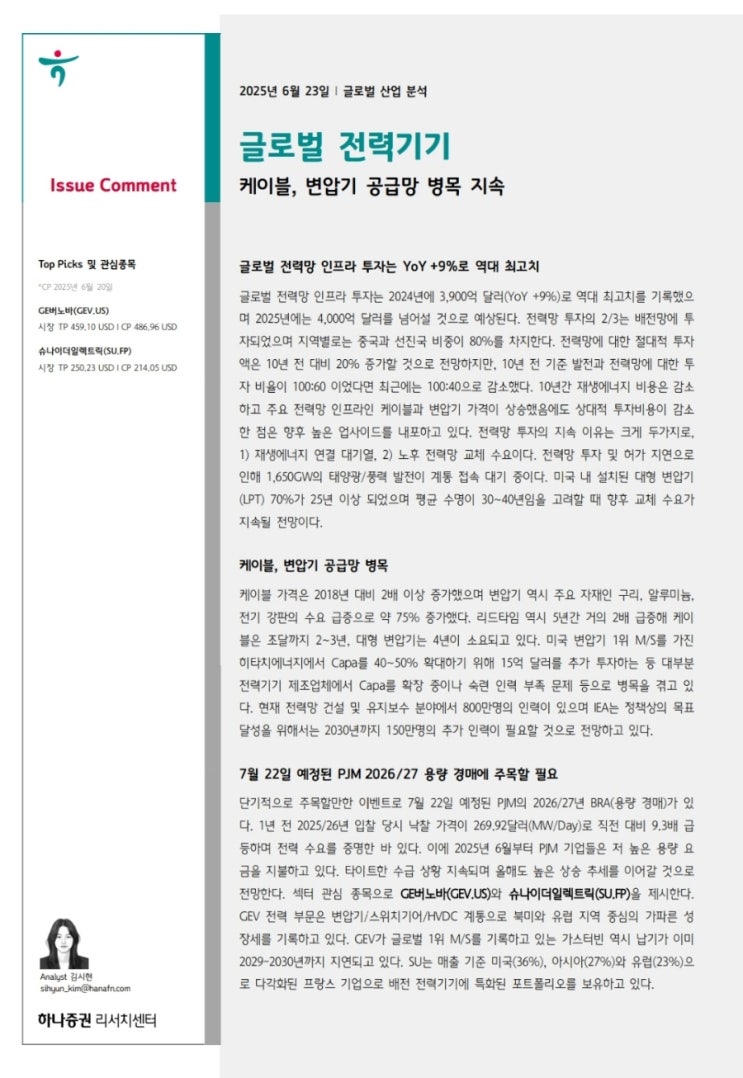 1. 오늘은 진짜 짧은 두장짜리 리포트 대충 훑어보기. 하나증권에서 만든 리포트고 글로벌 전력기기, 케이...