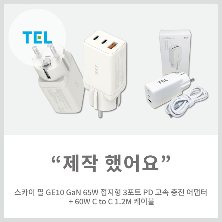 [메이드올] 스카이 필 GE10 GaN 65W 접지형 3포트 PD 고속 충전 어댑터 + 60W C to C 1.2M 케이블 제작
