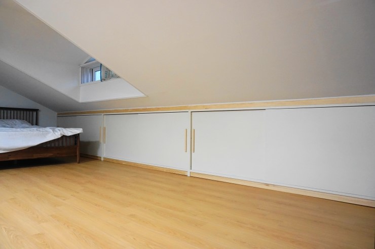 복층 수납장 맞춤 복층에 올라가면 박공형 지붕아래 각이진곳이 있다. 창문아래 ...