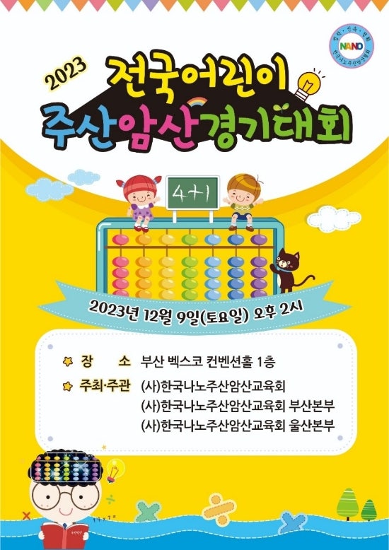 2023 전국어린이 주산암산 경기대회가 있어요. 부산 벡스코에서 2023년 12월 9일에 있답니다. 저는 울산이...