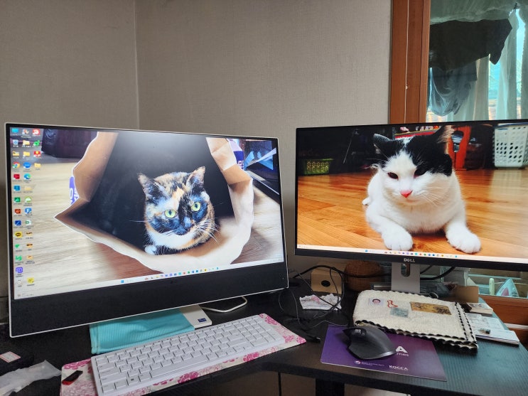 듀얼 모니터를 사용합니다. 배경화면은, 직접 찍은 사진 40여장을 저장해 1시간마다 랜덤으로 바뀌도록 설...