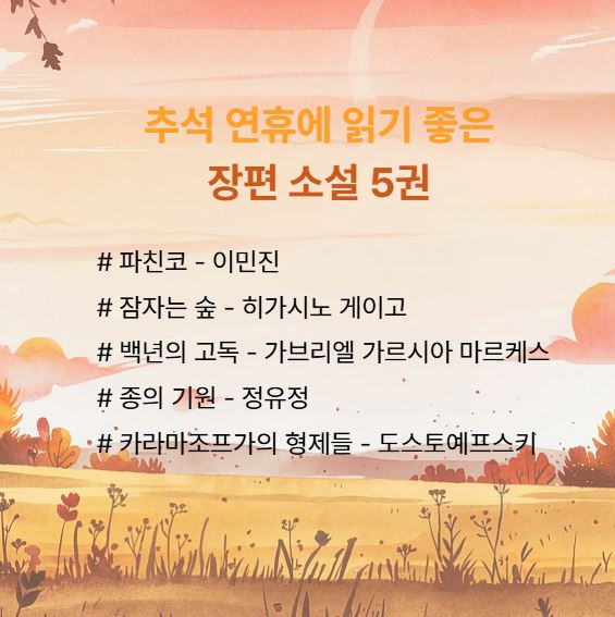 추석 연휴에 읽기 좋은 장편소설 추천 5권 (스테디셀러 중심)