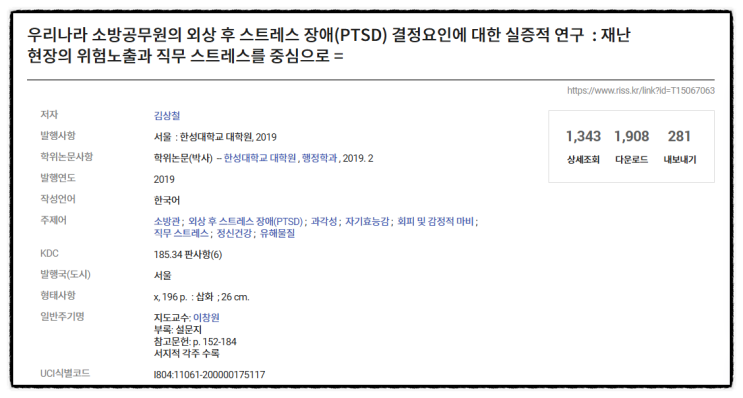 우리나라 소방공무원의 외상 후 스트레스 장애(PTSD) 결정 요인에 대한 실증적 연구, 김상철, 한성대학교대학