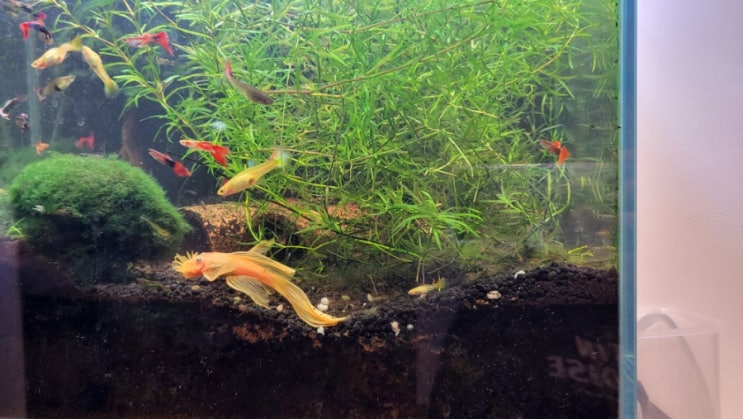 우리집 어항 지형의 반은 안시가 바꾼다. 심심하면 흙 파서 구덩이를 만드는데, 그 위에 이제 마리모가 침...