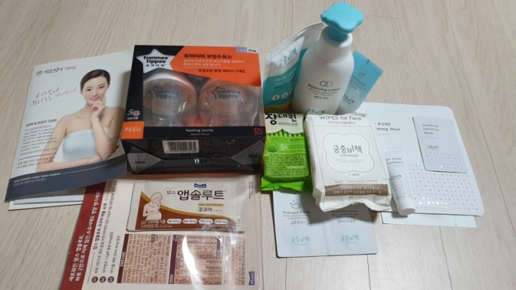 2019. 4.18. 하트맘 산모교실. 기본선물: 꼬무신, 물따로물티슈, 비 더마틱 로션 샘플, 리노베라 칼슘파우...