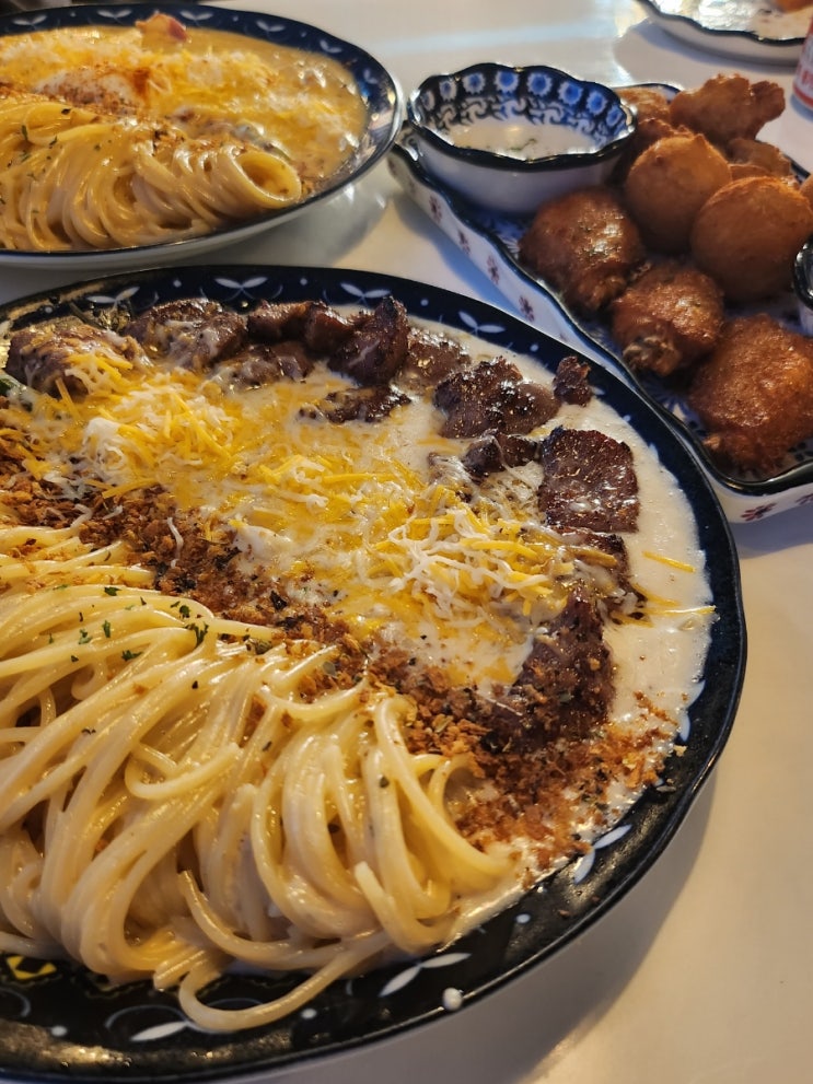 오랜만에 간 잠실 파스타집이야 방이동 먹자골목에 있다 스테이크 크림 파스타 위에 저 빨간 거 없으면 더 ...