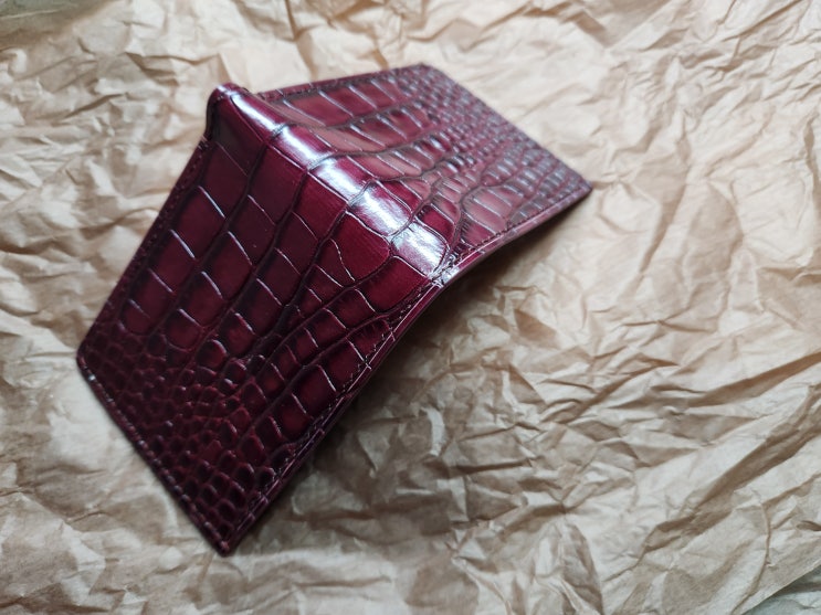 안녕하세요 본 제품은 이태리 소가죽에 스펀지로 손 염색한 악어무늬 가죽과 렐마 크리스페 가죽 버건디 색...