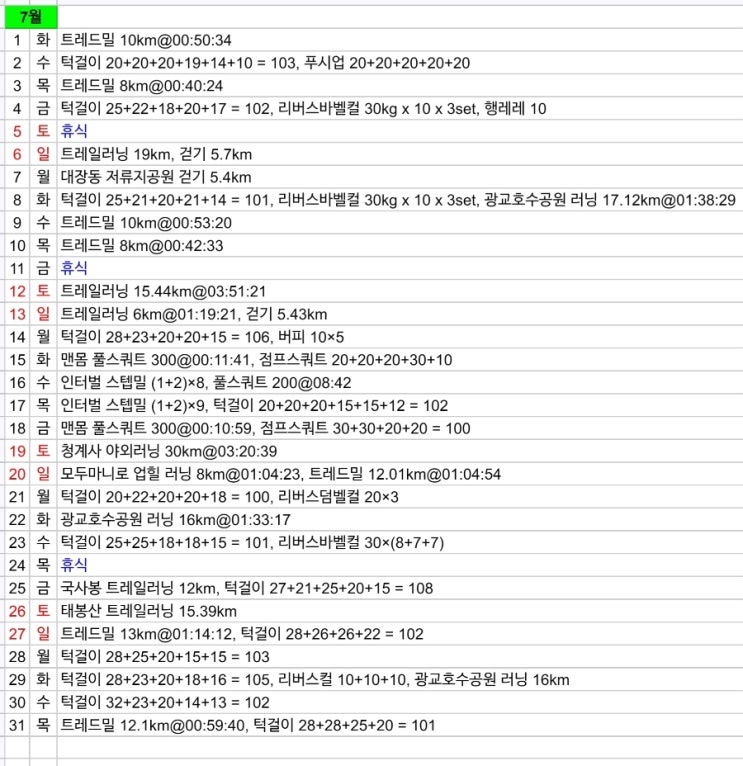7월에도 쉬지않고 움직였습니다. 3번의 휴식이 있었지만, 다른 운동하기 싫었던 날에는 간단하게 걷기나 턱...