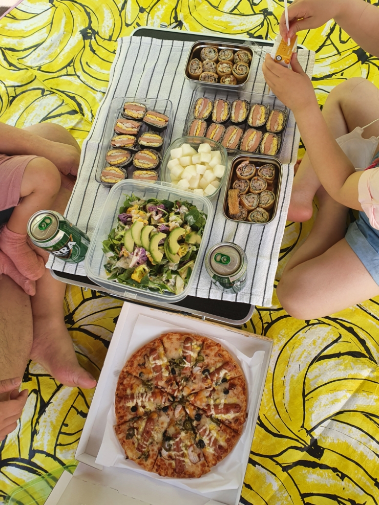 어린이날 어딜가도 힘들거같아서 간단하게 먹을거 싸들고 나가 아파트 단지 내에서 피크닉했어요~ 피자한판...