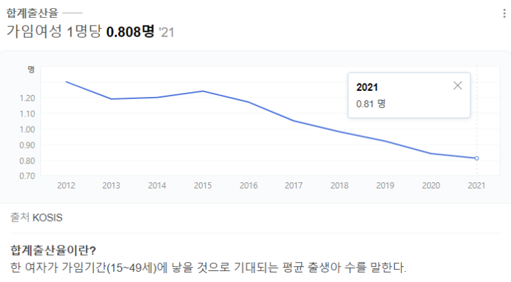 대한민국 출산율이 세계에서 제일 낮은건 어제 오늘 얘기가 아니다. 아래 차트를 보자. 2021년 0.81명이던...