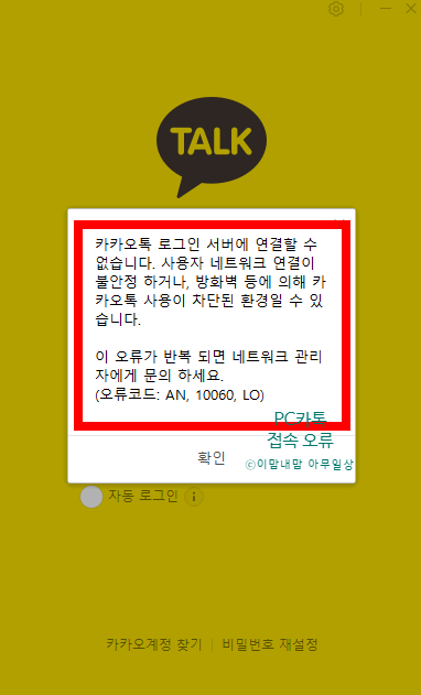 난데없이 PC카톡 로그인이 안됨. 휴대폰으로 카톡은 되는데 PC카톡은 로그인 자체가 안되고 저 메세지...