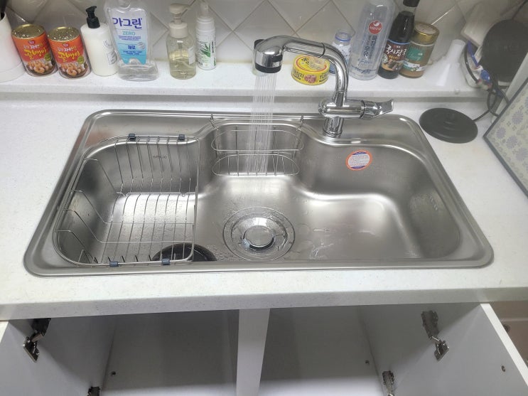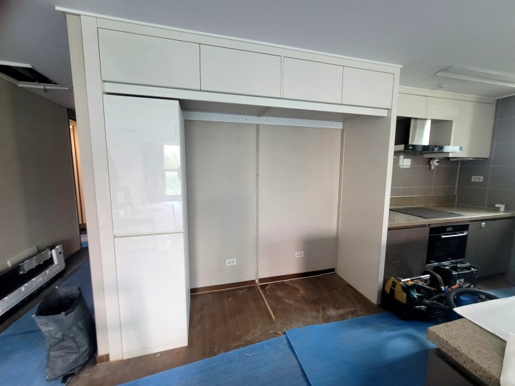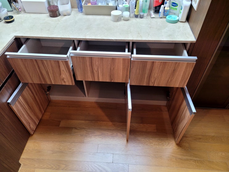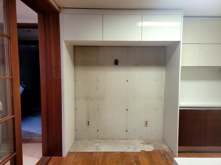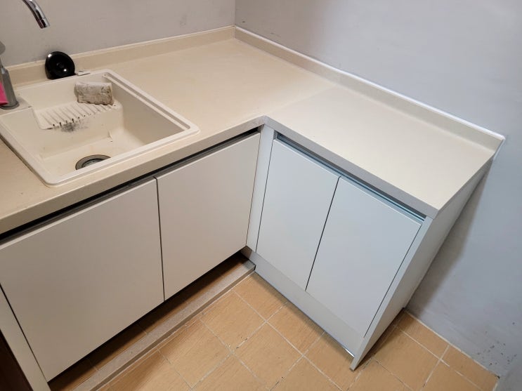 씽크대 하부 장 아래 사용하지 않는 김치냉장고와 가스오븐을 철거해 버리고 수납을 할 수 있게 서랍장과 ...