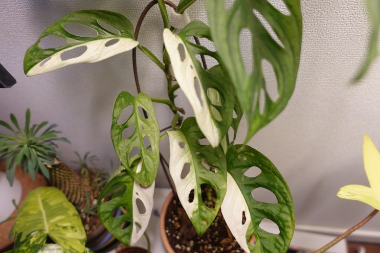 약 1년 전 식친에게 선물받은 반반 무늬 아단소니가 무럭 무럭 자라더니 열심히 초록잎만 만들어내기 시작...