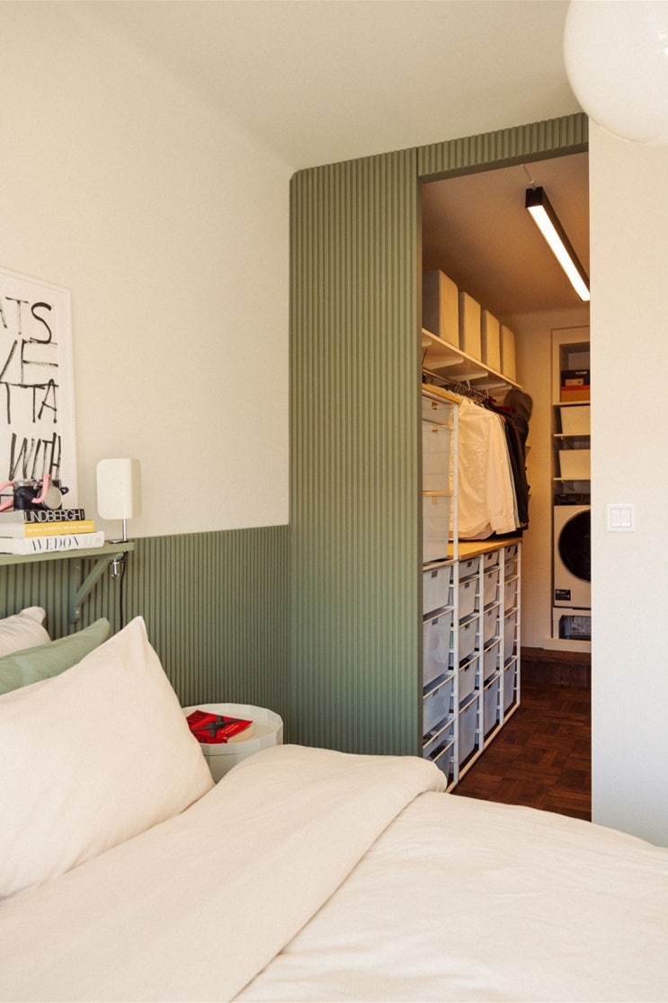 14평 아파트인테리어에는 워크인 맞춤 옷장이 감쪽같이 숨어있는 곳이 있습니다, 바로 침대헤드 옆쪽 벽면...