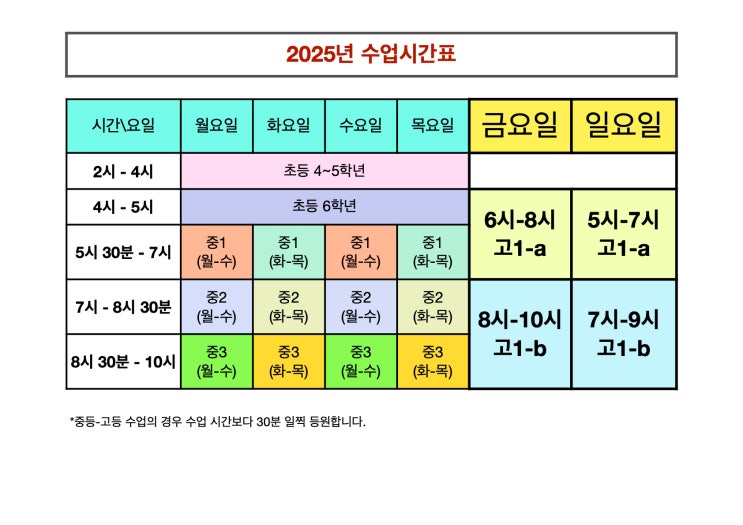 2025년 학기 시간표 | 일월초 수학공부방 | 율현중 수학공부방