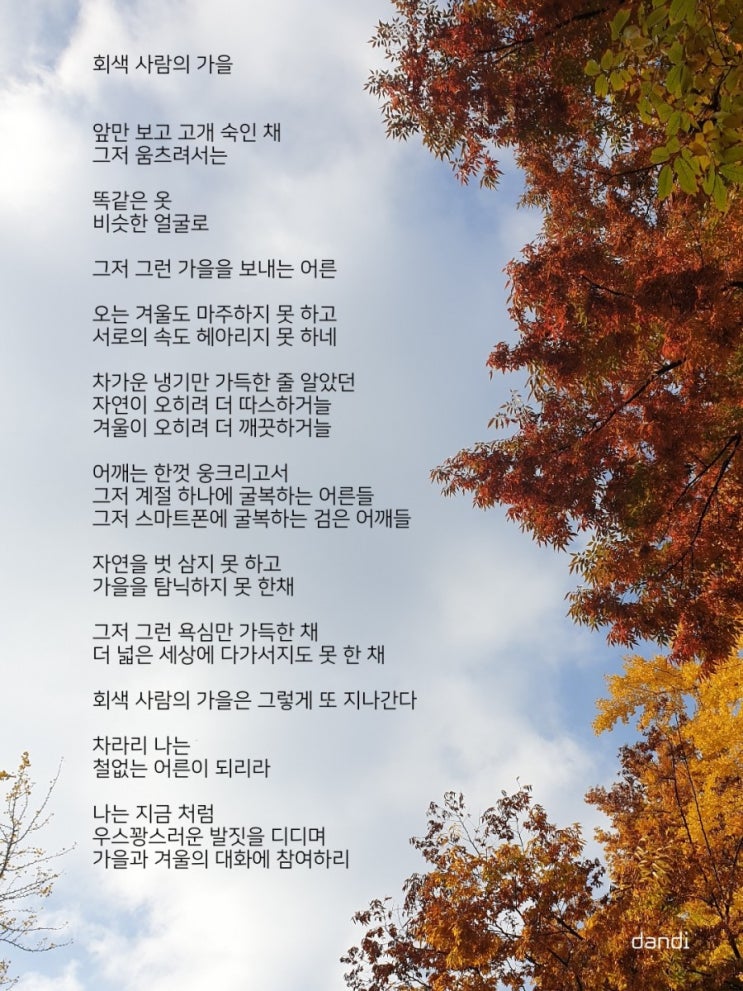 회색 사람의 가을 앞만 보고 고개숙인 채 그저 움츠려서는 똑같은 옷 비슷한 얼굴로 그저 그런 가을을 보내...