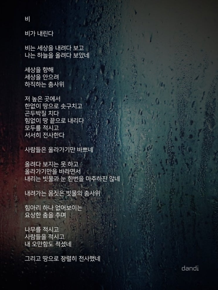 비 비가 내린다 비는 세상을 내려다 보고 나는 하늘을 올려다 보았네 세상을 향해 세상을 안으려 하직하는 ...