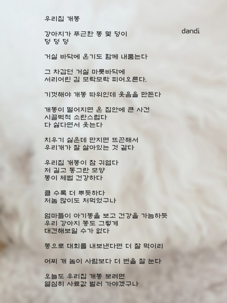 나만의 개똥철학 우리집 개똥이 우리집의 행복이다. 행복은 멀리 있지 않다. 우리집 개똥에 있다. Written...