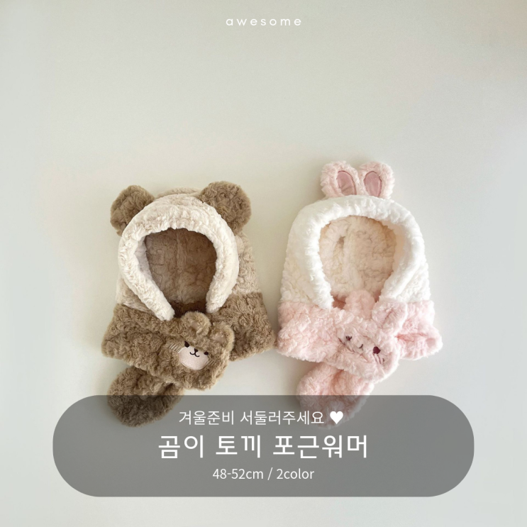 곰이 토끼 포근워머 보들보들 요 털원단 아시죠 ? 껴안고 자고싶은 보송이 원단에 목도리 + 모자 까지 함께...