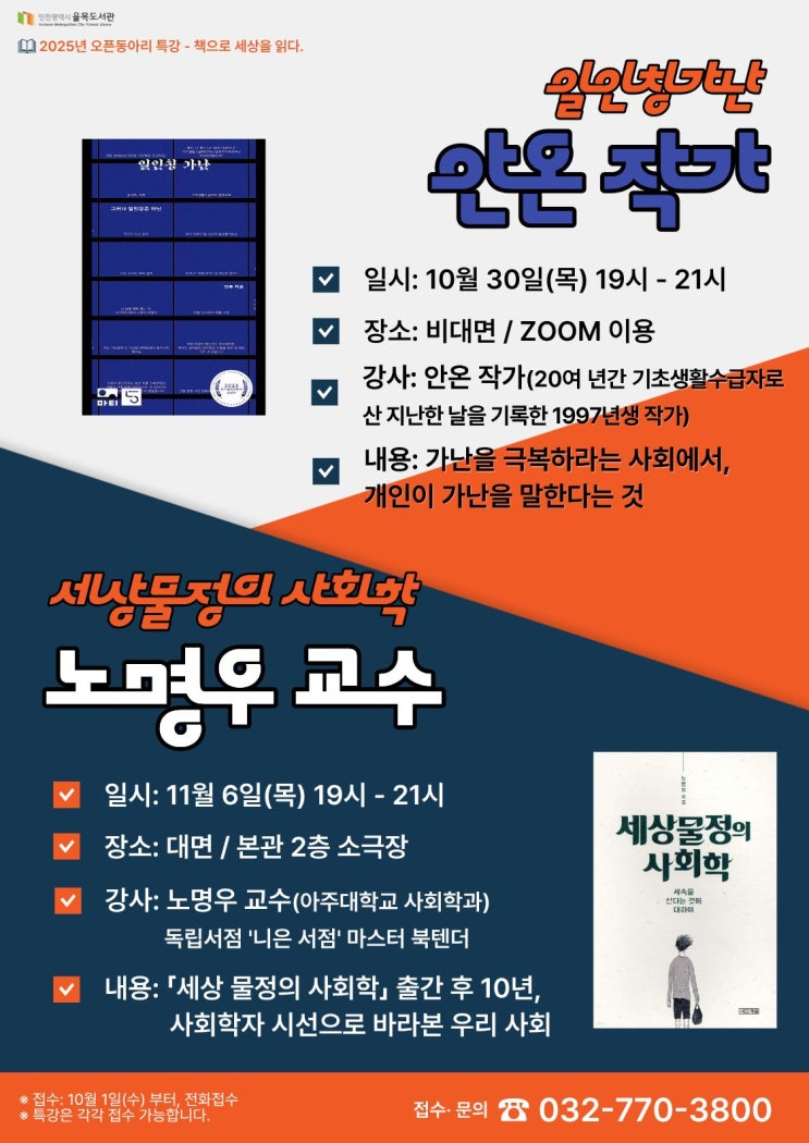 행사 | [오픈동아리 특강] '일인칭 가난' 안온 작가& '세상물정의 사회학' 노명우 교수와의 북토크