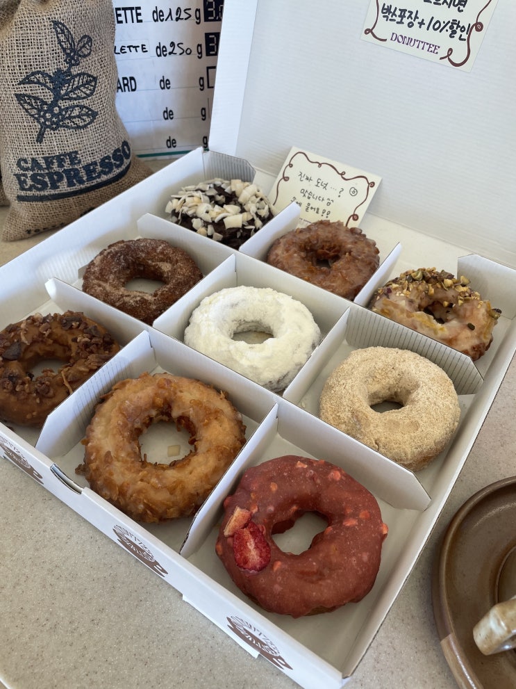 늦은 주간일기 스타뜨! 저번에 가서 커피만 먹었던 '도너티' 동료들 청첩장주러 가면서 빈손으로...