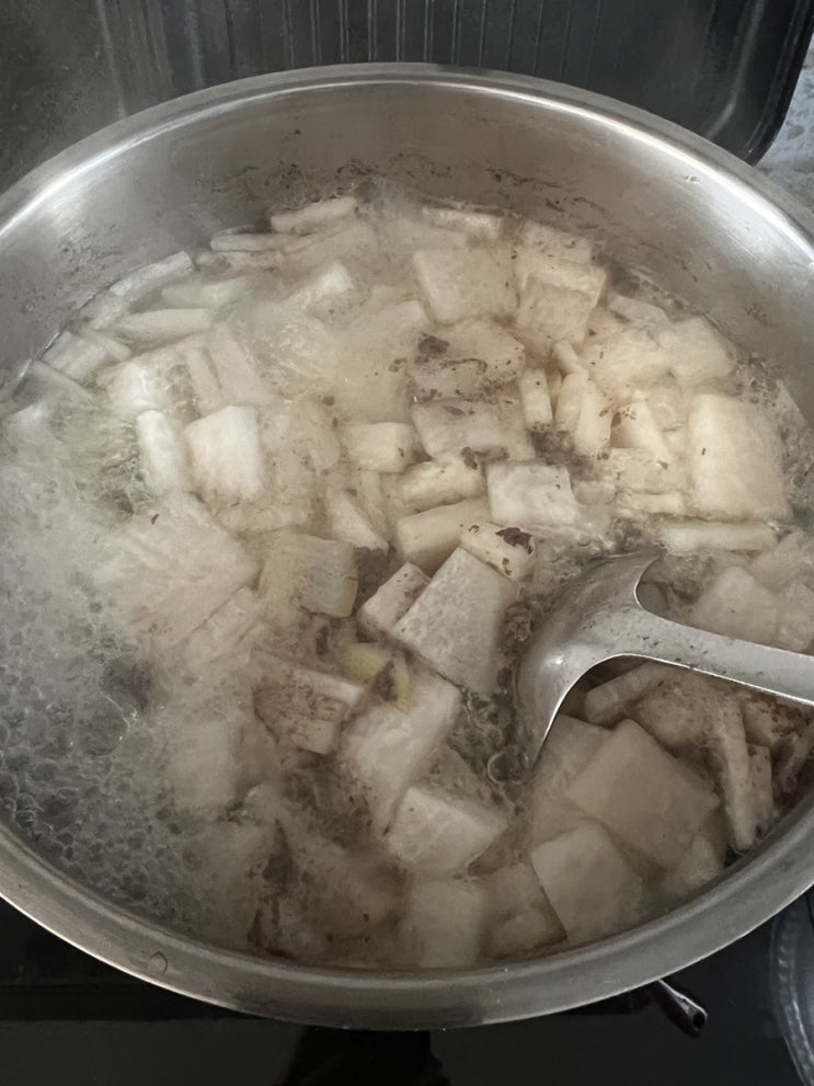 소고기 무국 무국 고기 핏물빼기 무썰기 파썰기 고기 자르기 고기 간하며 볶기 무 추가 국간장 참기름 소금...