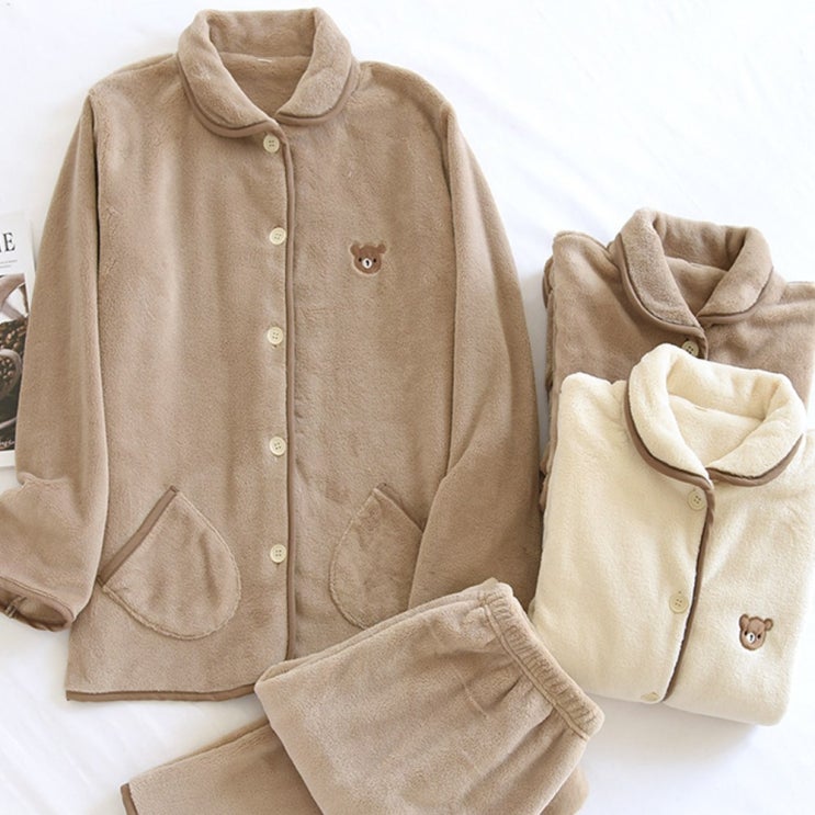 포근한 곰돌이 자수 커플 극세사 수면잠옷 세트