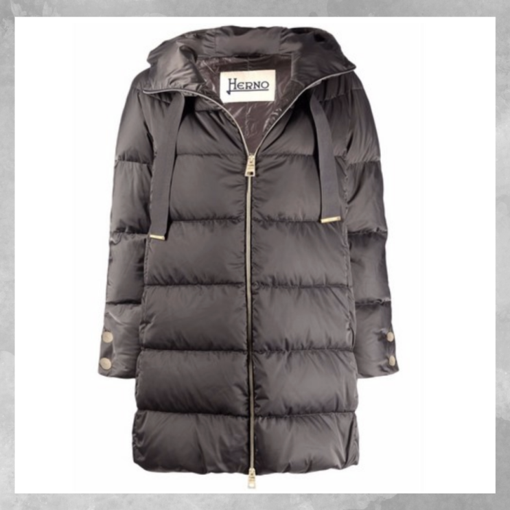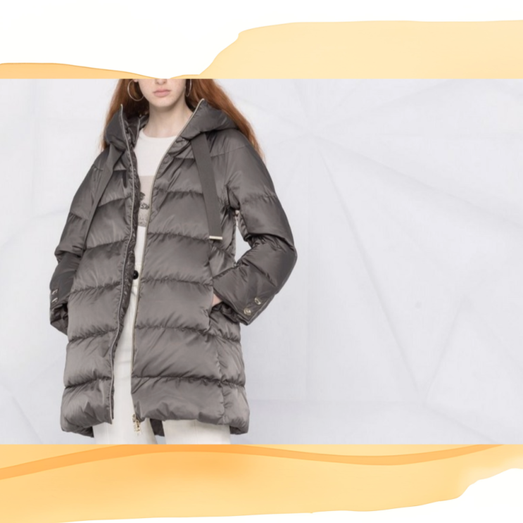 차분한 그레이 컬러 위로 길게 내려오는 독특한 후드 스트링. 에르노패딩 후드 조절 끈 디테일 패딩 코트는...