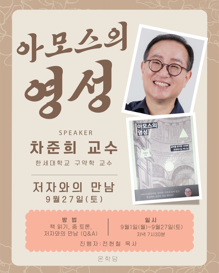 신간 함께 읽기 “아모스의 영성” 일시 : 9월 1일부터 27일, zoom, 카톡 저자와의 만남 : 9월 27일 (토) z...