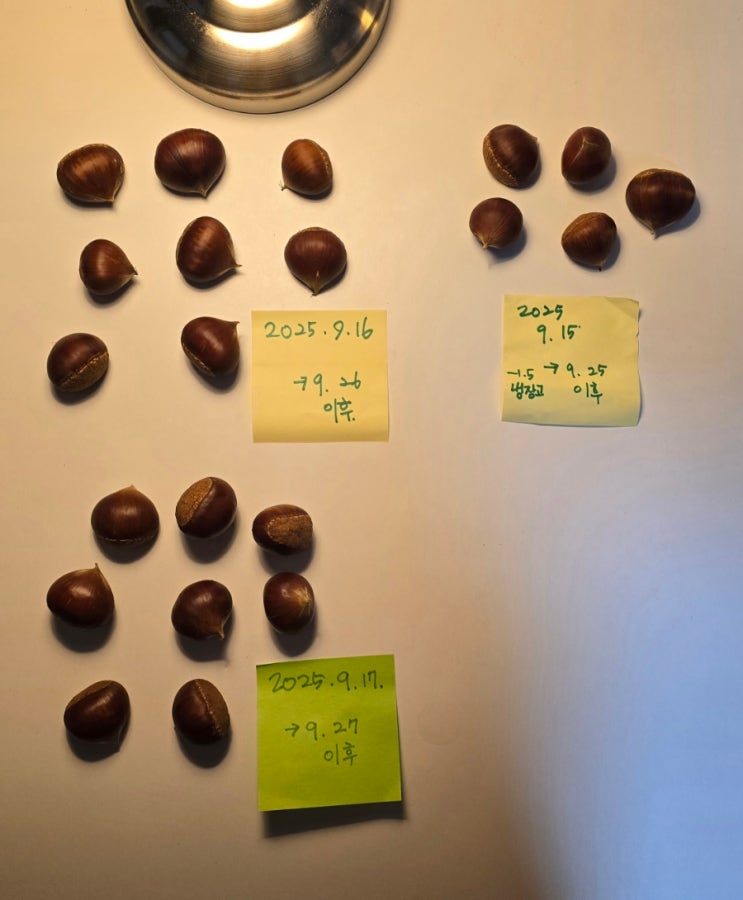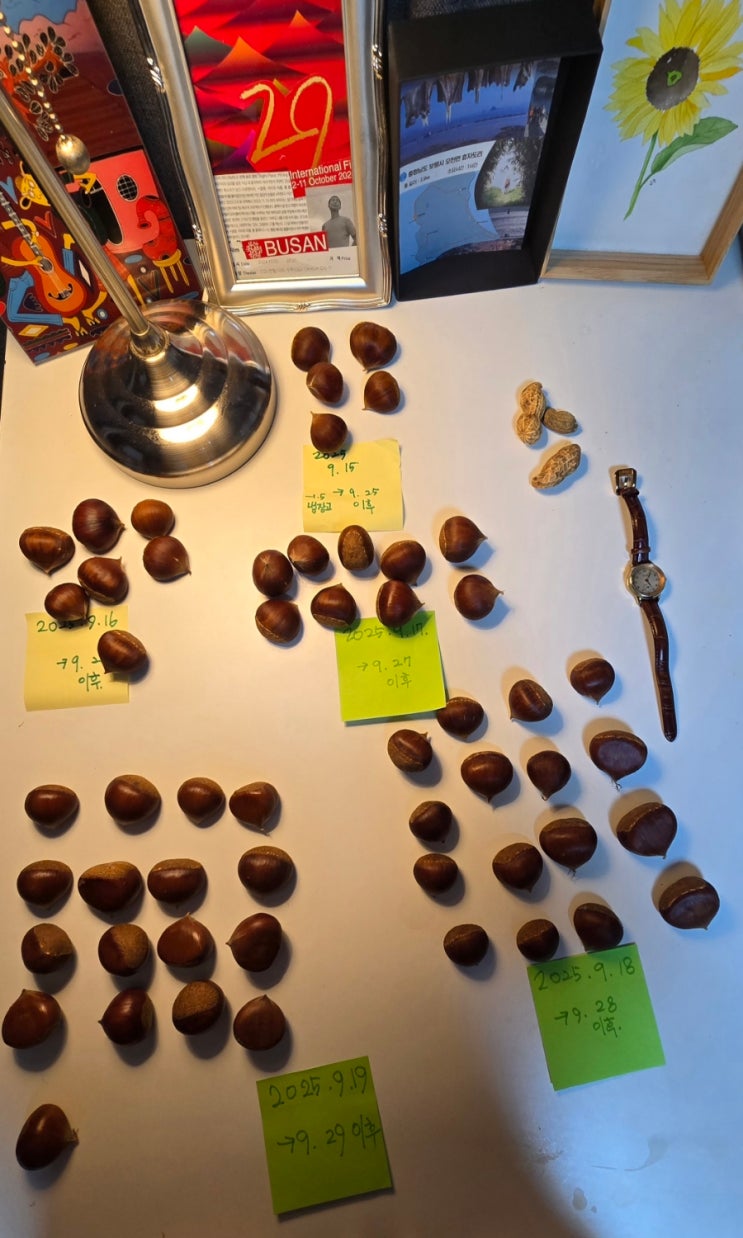 어제도 산책길에 밤을 주웠다. 엊그제 주운 밤과 그제 주운 밤을 어제 아침 책상 위에 저렇게 놓아두었는데...