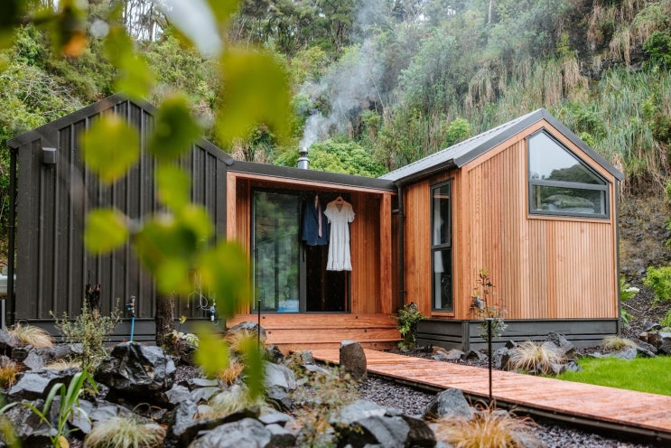 뉴질랜드 숲 속에 자리한 소형목조주택. 나무데크와 모듈러주택 구조가 만든 아늑한 힐링 공간을 소개합니...
