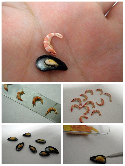 닭발의 폴리머클레이로 만든 미니어쳐 홍합과 새우