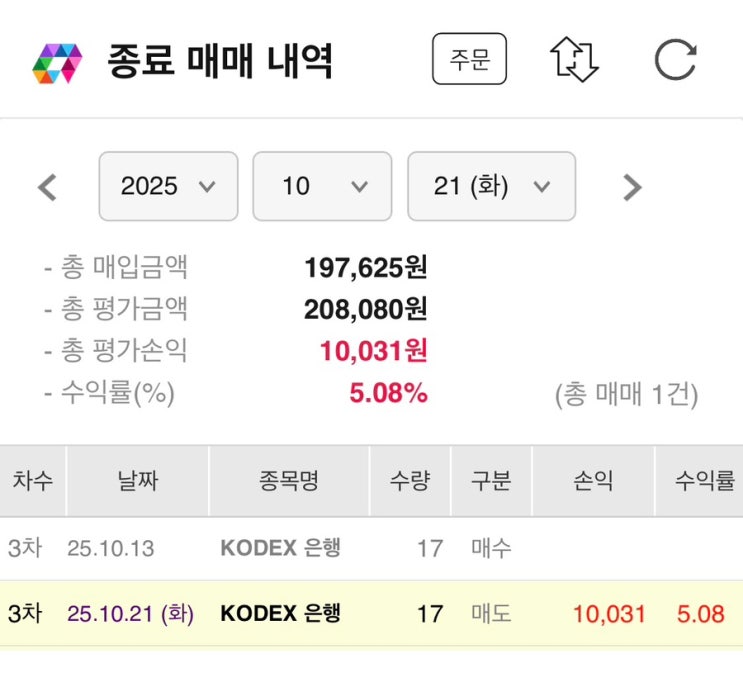 25년 10월 21일, 매직스플릿 수익실현(KODEX 은행)