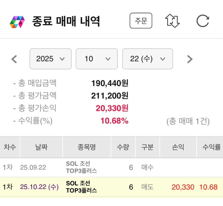 25년 10월 22일, 매직스플릿 수익실현(SOL 조선TOP3플러스)