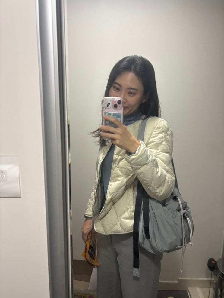 지오다노 경량 패딩이랑 육육걸즈 그레이데님이랑 로우로우 숄더백이랑 뉴발란스 530 데일리룩 코디