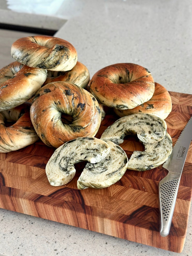 맛있는 베이글에 국산 쑥을 듬뿍 넣었다 봄 한정이라 부지런히 사 먹고 쟁여두자!! 차가운 버터 잔뜩 얹어 ...