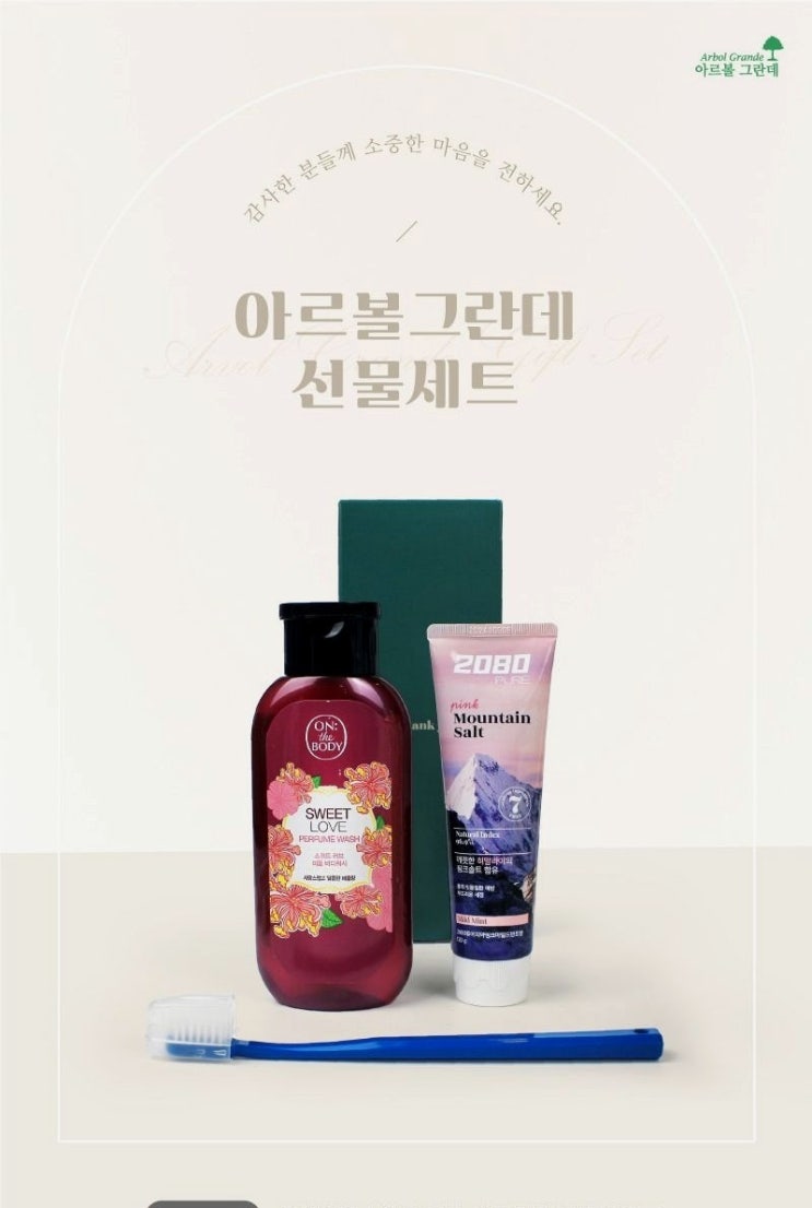 로고 각인 선물 LG 온더바디 바디워시 2080 핑크솔트치약 미세모칫솔 증정품