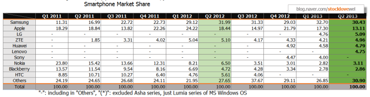 [130729, 모바일] 세계 스마트폰 판매량 및 시장점유율 (2013년 2분기 확정치)