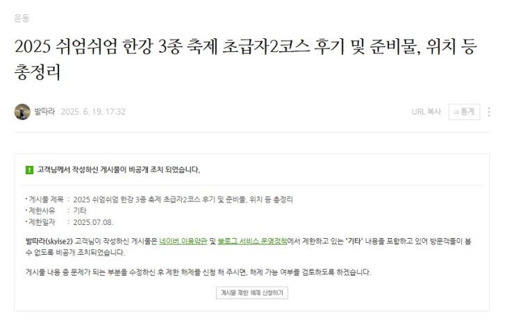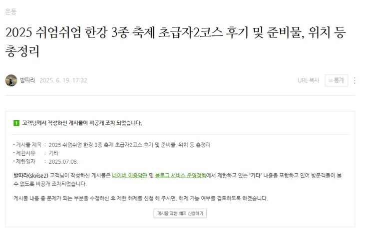 어제 6월에 작성한 쉬엄쉬엄 한강 3종축제 후기 포스팅이 갑자기 비공개 처리가 되면서 그 사유가 명확하지...