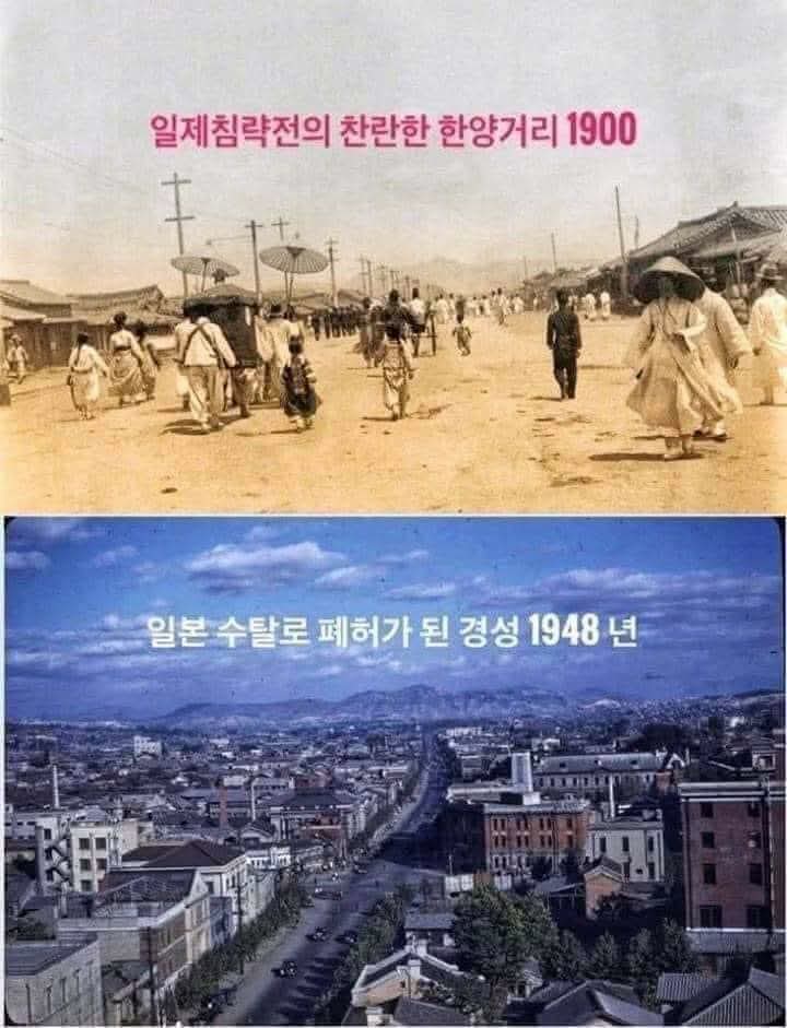 [역사바로잡기] 반일감정은 정신병이다. 일제(일본제국)가 한반도에 쳐들어와서 강제점령하여, 수탈했다는 서울종로의 1902년과 1940년의 모습이다.