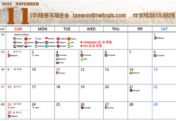 물류, 해운, 포워딩달력 (2025년 11월)