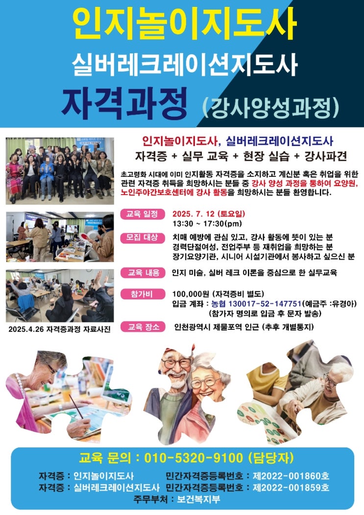 실버 강사 활동을 하고 싶은 분! 실무 교육 중심 맞춤 강사 양성 과정!인지미술, 인지음악, 실버레크, 전래놀이 강사 도전!