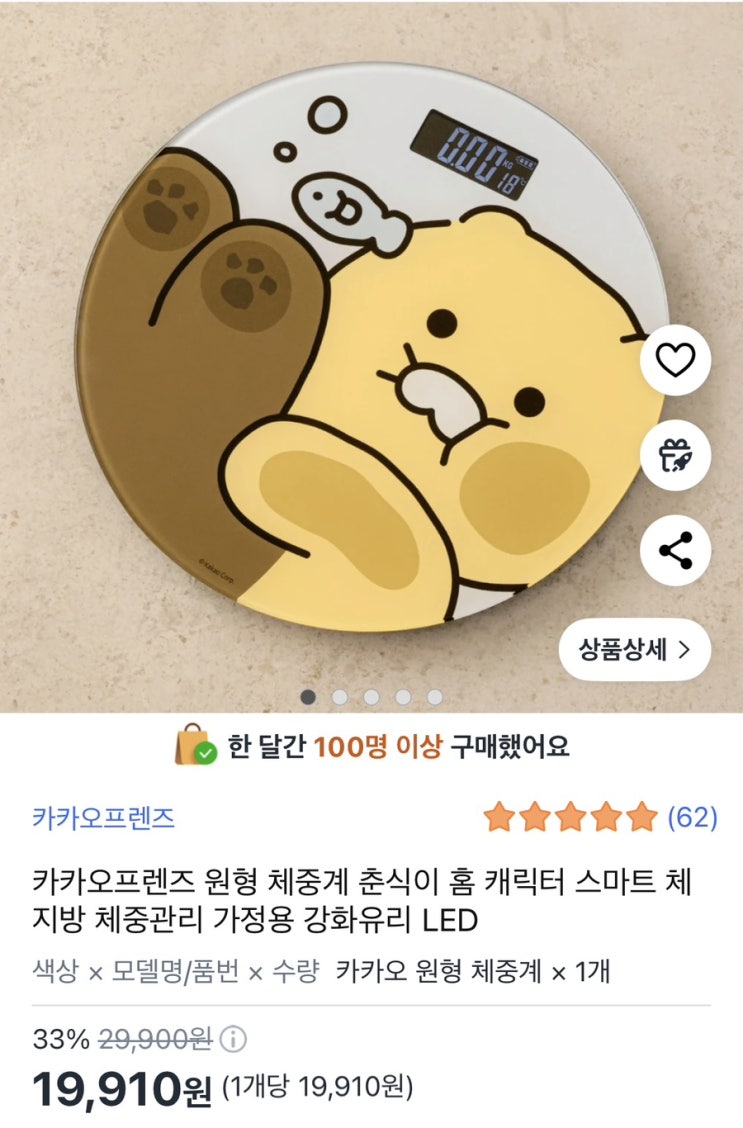 33%카카오프렌즈 원형 체중계 춘식이 홈 캐릭터 스마트 체지방 체중관리 가정용 강화유리 LED