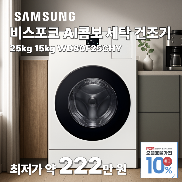 넾다세일 최저가 약 222만 원! 삼성 비스포크 AI콤보 세탁기 건조기 일체형 25kg 15kg WD80F25CHY 1등급 으뜸효율, 가격 할인 및 사이즈 기능