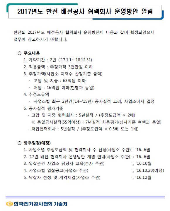2017년 한전, 배전협력회사 운영방안 발표 고압및 지중공사는 추정도급액이 63억으로 상향조정되었...