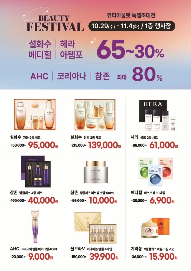 강북점 최초! 뷰티 아울렛 특별초대전 설화수/헤라/메디힐/아템포 AHC/코리아나/참존 최대 80%